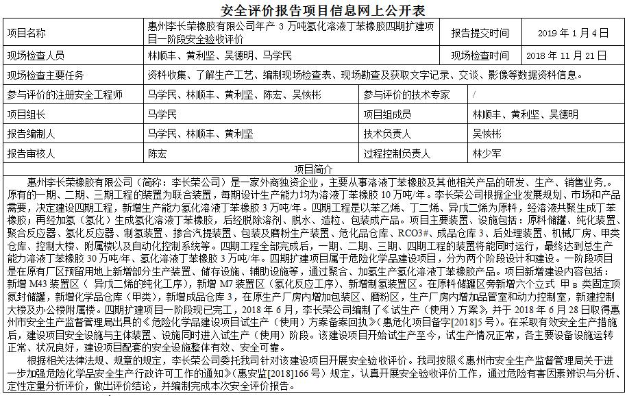 惠州李长荣橡胶有限公司年产3万吨氢化溶液丁苯橡胶四期扩建项目一阶段安全验收评价