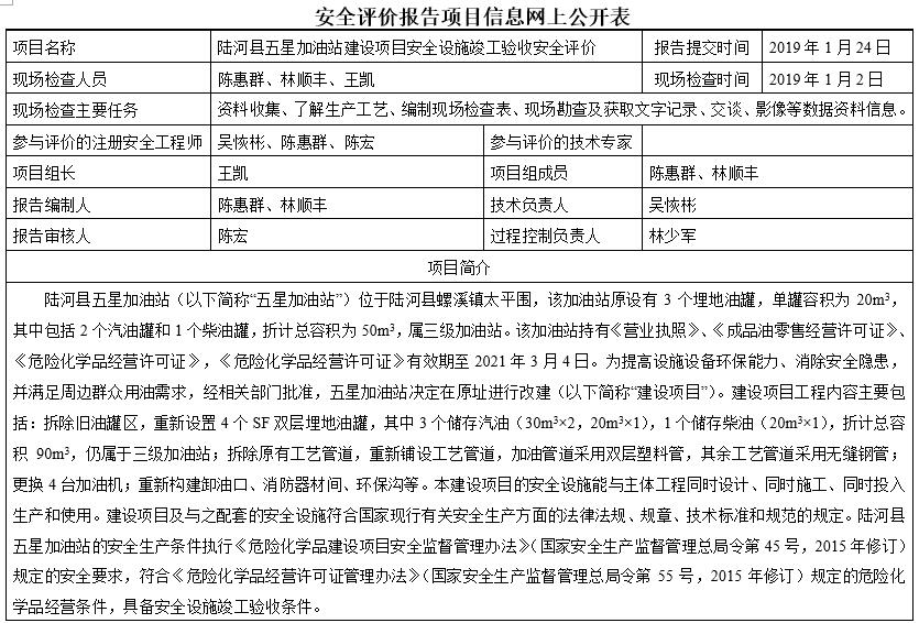 陆河县五星加油站建设项目安全设施竣工验收安全评价