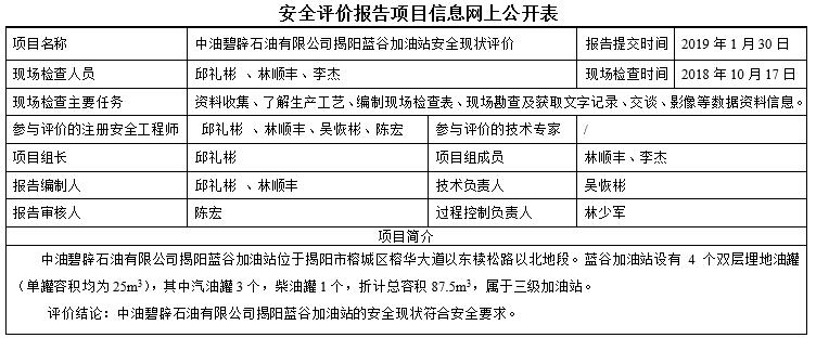 中油碧辟石油有限公司揭阳蓝谷加油站安全现状评价
