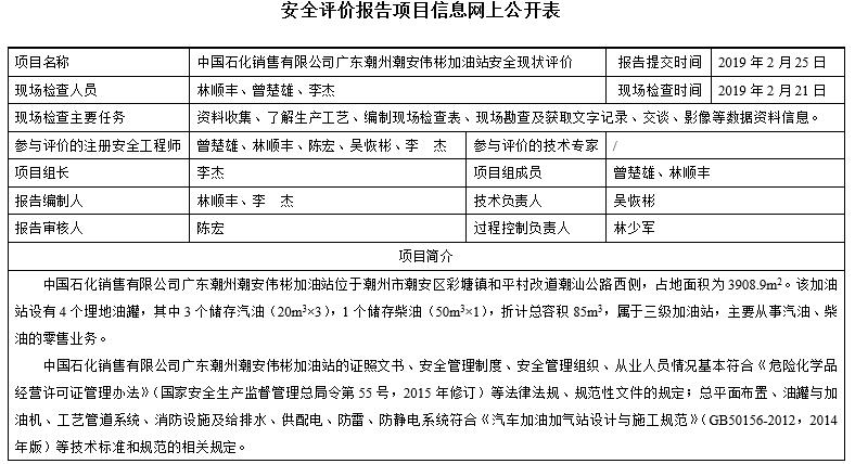 中国石化销售有限公司广东潮州潮安伟彬加油站安全现状评价