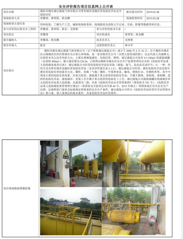 揭阳市揭东谢记液氨气体有限公司带有储存设施经营危险化学品安全现状评价