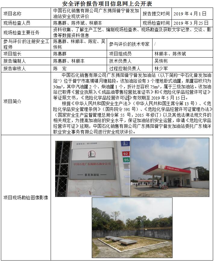 中国石化销售有限公司广东揭阳普宁普发加油站安全现状评价