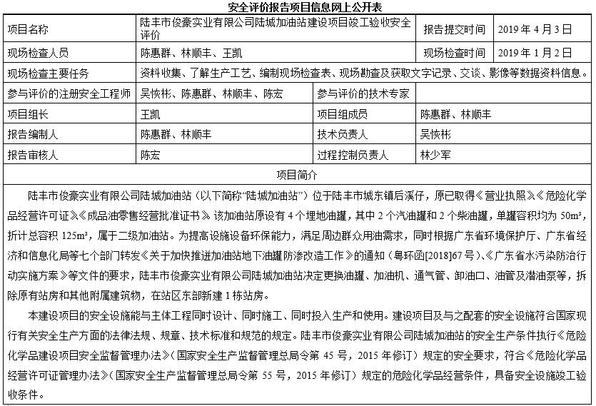 陆丰市俊豪实业有限公司陆城加油站建设项目竣工验收安全评价