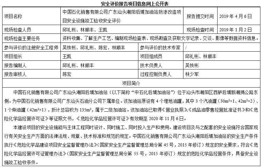 中国石化销售有限公司广东汕头潮阳后埔加油站防渗改造项目安全设施竣工验收安全评价
