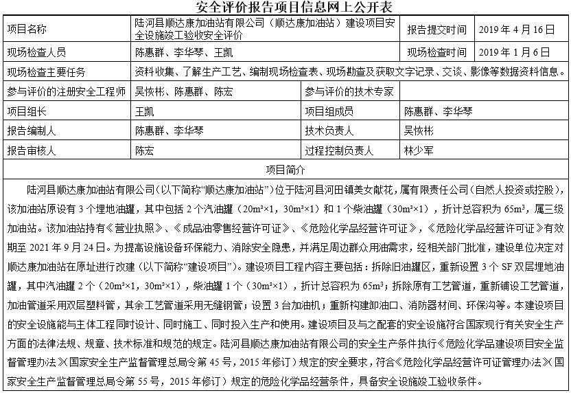 陆河县顺达康加油站有限公司(顺达康加油站)建设项目安全设施竣工验收安全评价