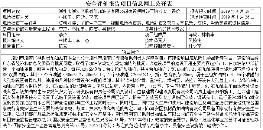 潮州市潮安区枫树员加油站有限公司建设项目竣工验收安全评价