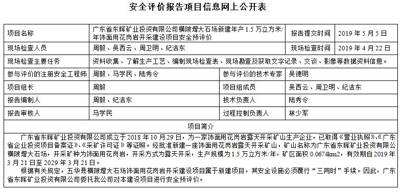 广东省东晖矿业投资有限公司横陂增大石场新建年产1.5万立方米/年饰面用花岗岩开采建设项目安全预评价