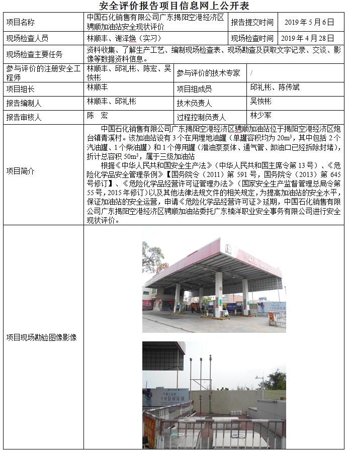 中国石化销售有限公司广东揭阳揭东顺丰加油站安全现状评价