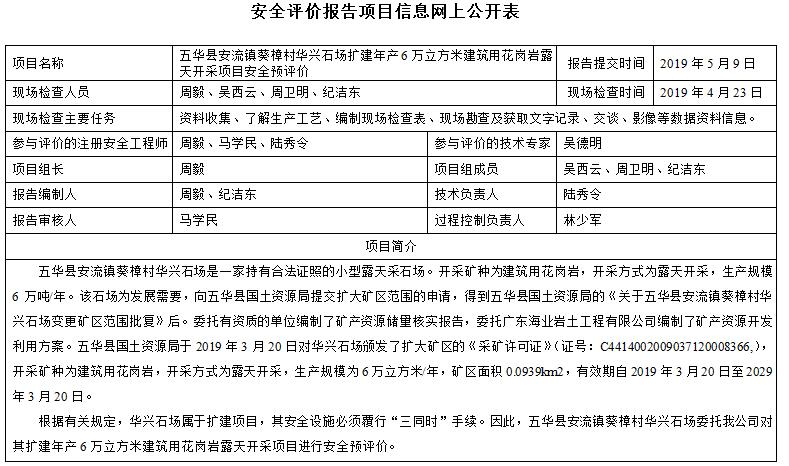 五华县安流镇葵樟村华兴石场扩建年产6万立方米建筑用花岗岩露天开采项目安全预评价