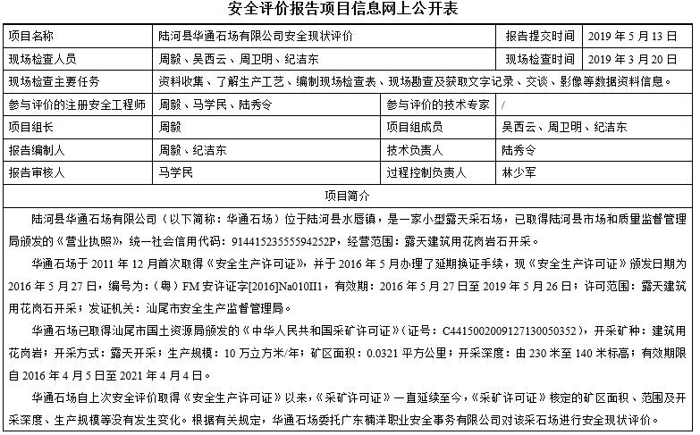 陆河县华通石场有限公司安全现状评价