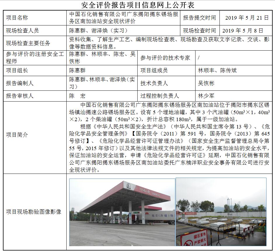 中国石化销售有限公司广东揭阳揭东锡场服务区南加站安全现状评价