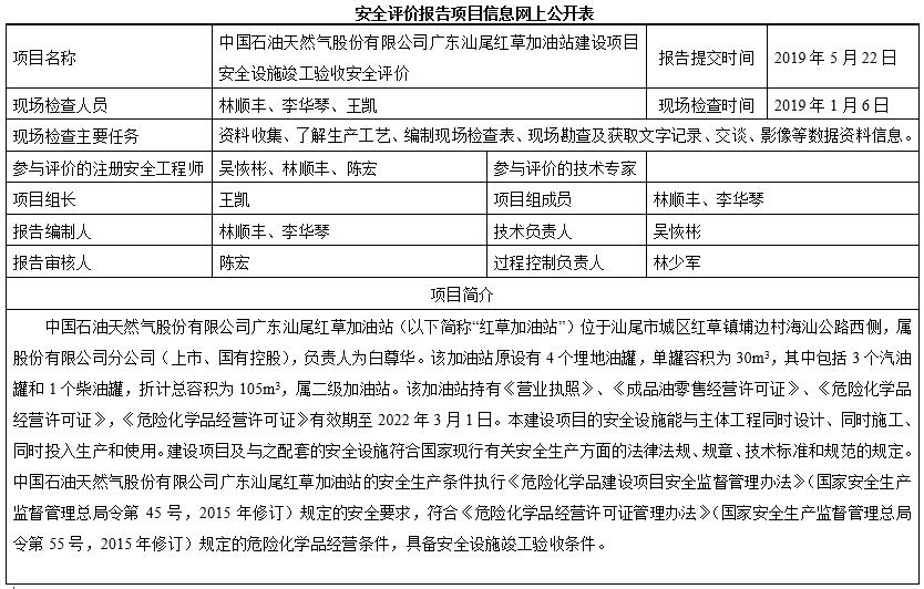 中国石油天然气股份有限公司广东汕尾红草加油站建设项目安全设施竣工验收安全评价