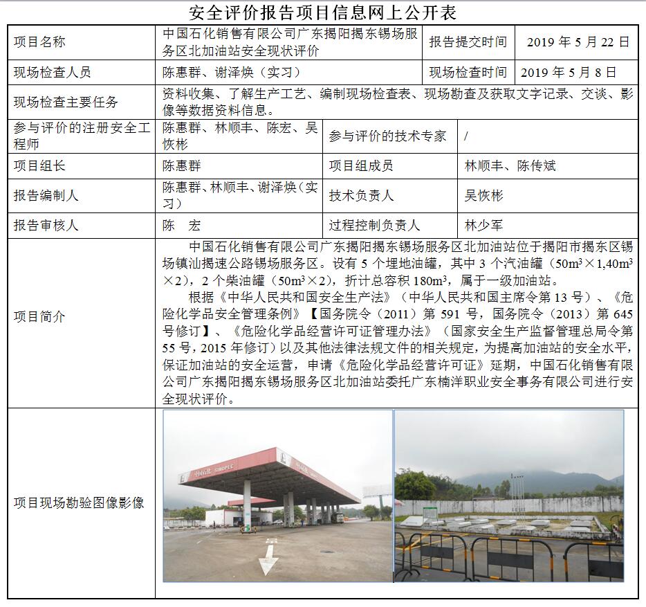 中国石化销售有限公司广东揭阳揭东锡场服务区北加站安全现状评价