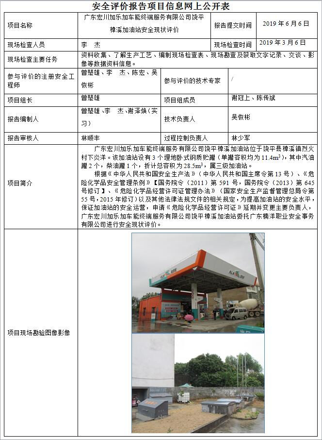 广东宏川加乐加车能终端服务有限公司饶平樟溪加油站安全现状评价