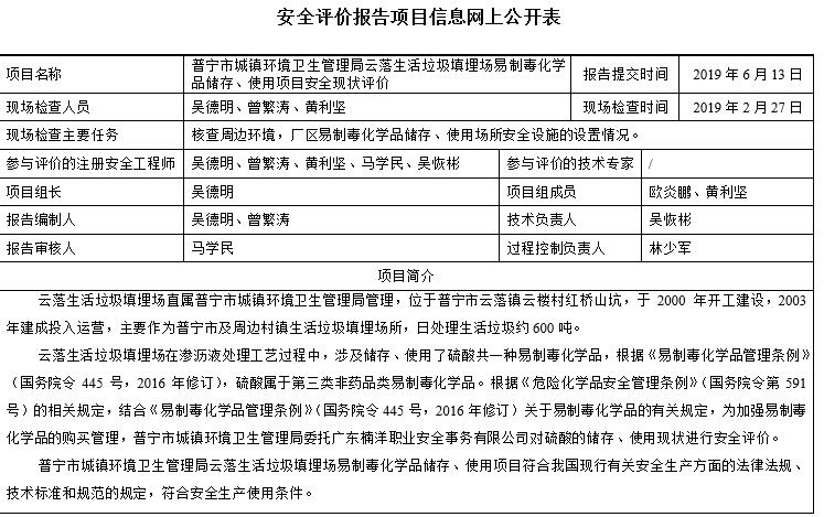 普宁市城镇环境卫生管理局云落生活垃圾填埋场易制毒化学品储存、使用项目安全现状评价