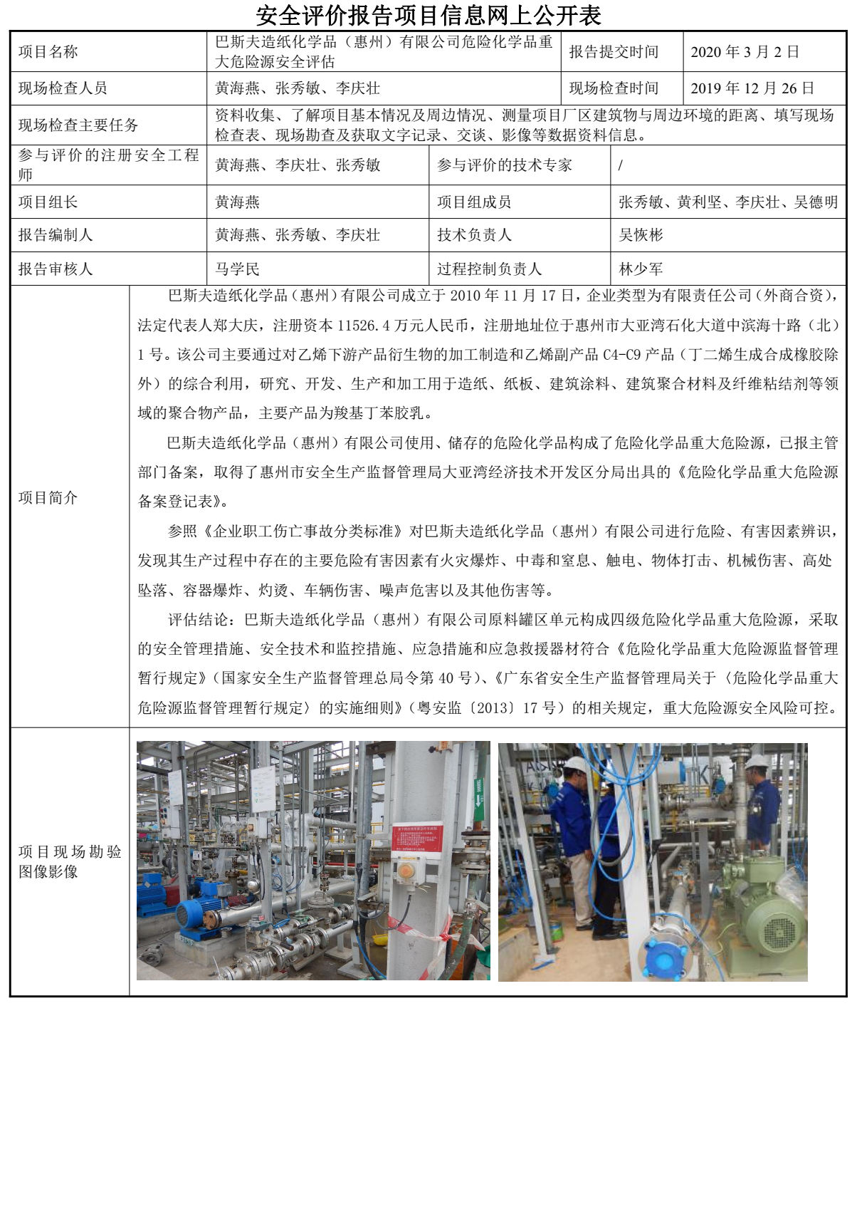 巴斯夫造纸化学品(惠州)有限公司危险化学品重大危险源安全评估