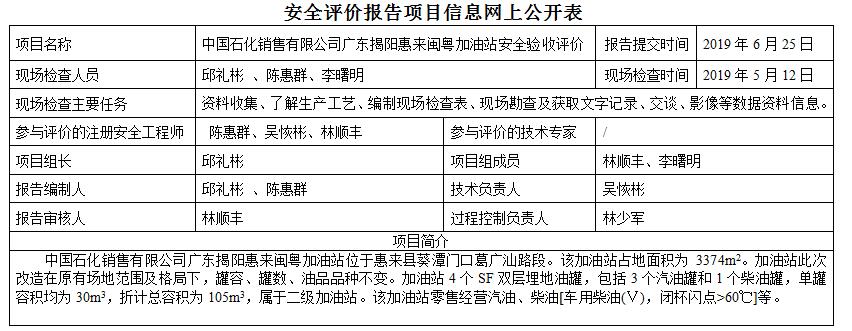 中国石化销售有限公司广东揭阳惠来闽粤加油站改建项目工验收安全评价
