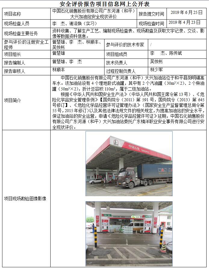 中国石化销售股份有限公司广东河源(和平)大兴加油站安全现状评价