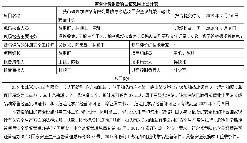 汕头市珠兴加油站有限公司防渗改造项目安全设施竣工验收安全评价