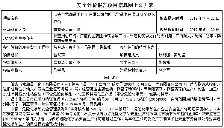 汕头市龙湖昌丰化工有限公司危险化学品生产项目安全现状评价