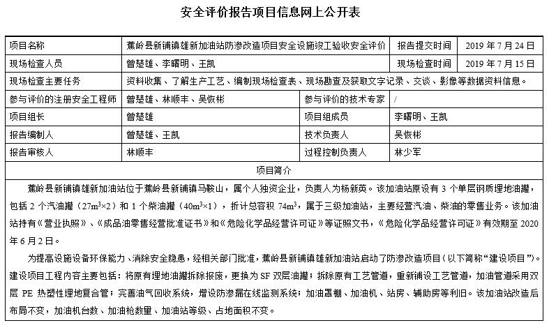 蕉岭县新铺镇雄新加油站防渗改造项目安全设施竣工验收安全评价