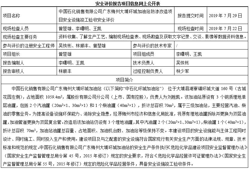 中国石化销售有限公司广东梅州大埔环城加油站防渗改造项目安全设施竣工验收安全评价