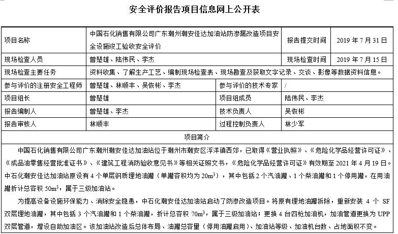 中国石化销售有限公司广东潮州潮安佳达加油站防渗漏改造项目安全设施竣工验收安全评价