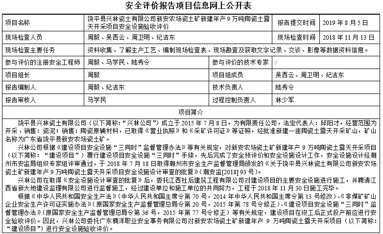 饶平县兴林瓷土有限公司新安农场瓷土矿新建年产9万吨陶瓷土露天开采项目安全设施验收评价