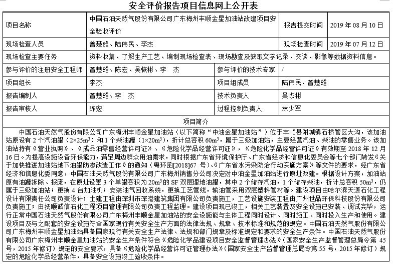 中国石油天然气股份有限公司广东梅州丰顺金星加油站建设项目安全设施竣工验收安全评价