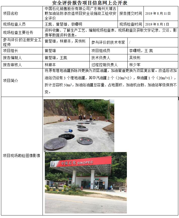 中国石化销售股份有限公司广东梅州大埔古野加油站防渗改造项目安全设施竣工验收安全评价