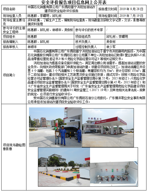 中国石化销售有限公司广东揭阳普宁洪阳加油站改建项目竣工验收安全评价