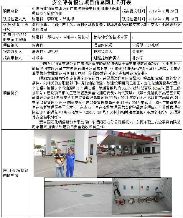 中国石化销售有限公司广东揭阳普宁顺驰加油站改建项目竣工验收安全评价