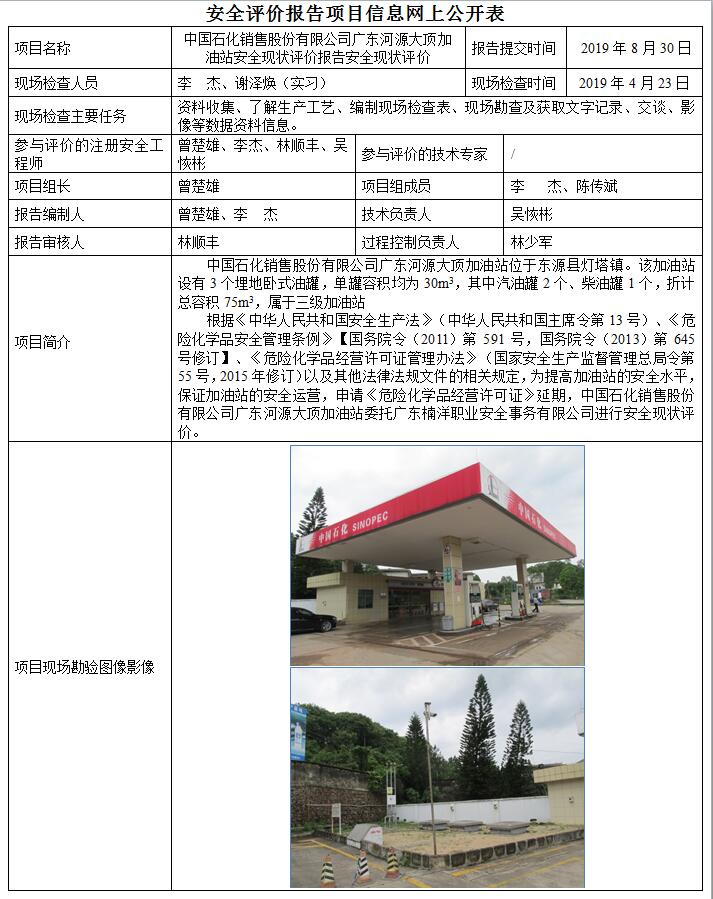 中国石化销售股份有限公司广东河源大顶加油站安全现状评价