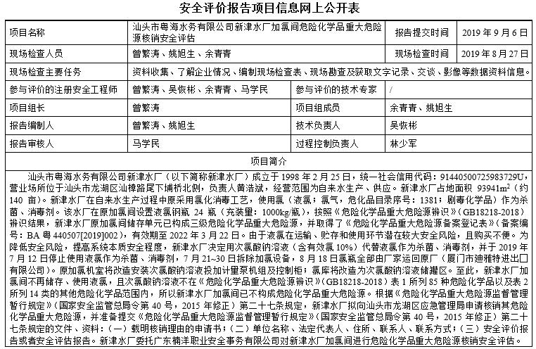 汕头市粤海水务有限公司新津水厂加氯间危险化学品重大危险源核销安全评估