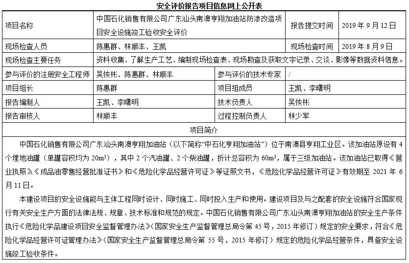 中国石化销售有限公司广东汕头南澳亨翔加油站防渗改造项目安全设施竣工验收安全评价