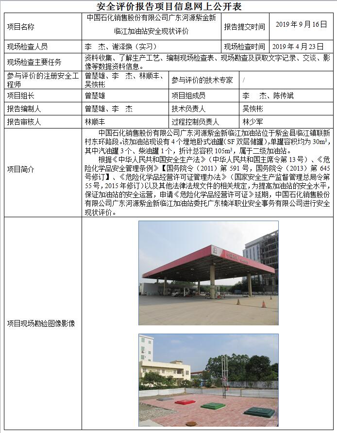 中国石化销售股份有限公司广东河源紫金新临江加油站安全现状评价