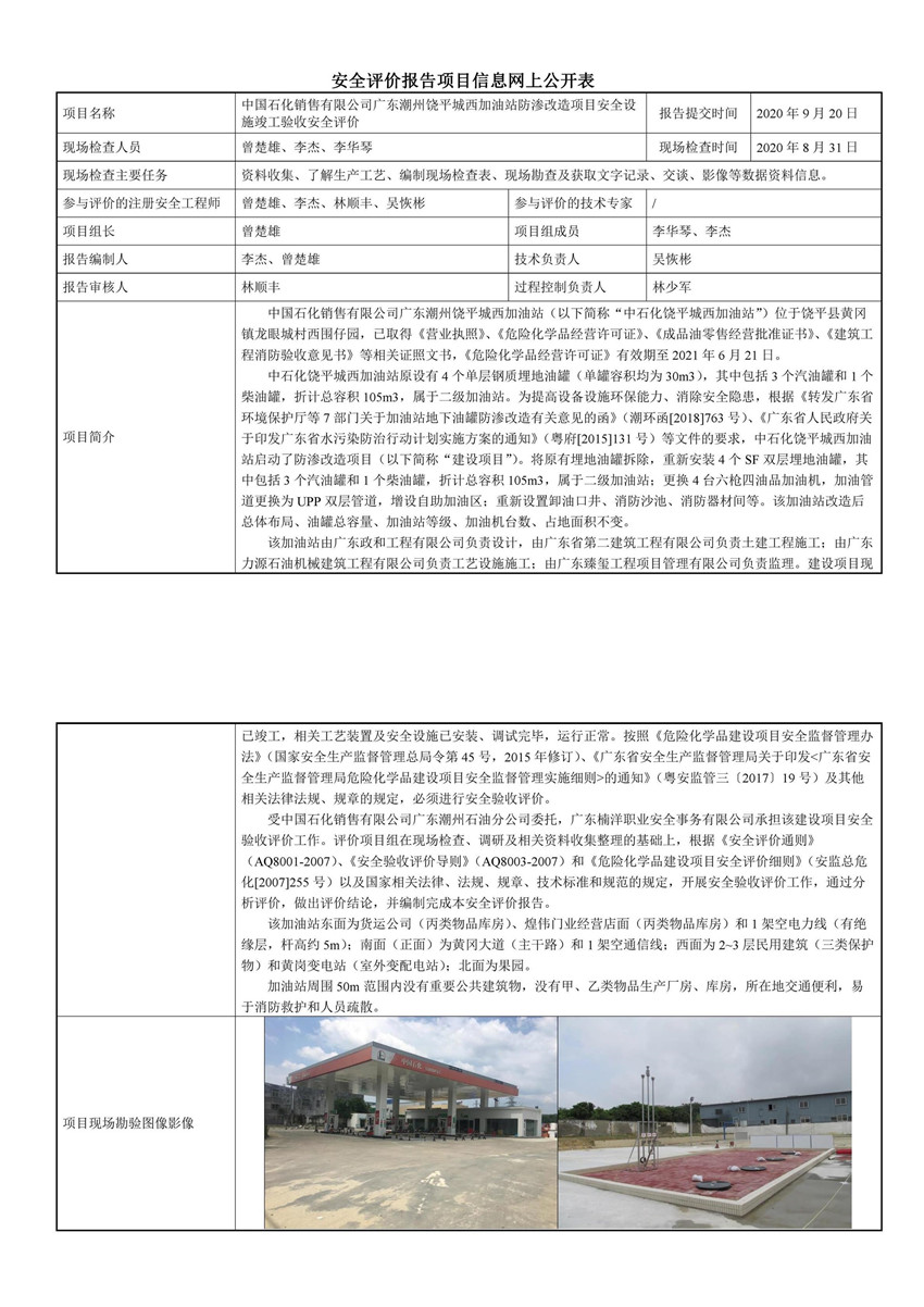 中国石化销售有限公司广东潮州饶平城西加油站防渗改造项目安全设施竣工验收安全评价