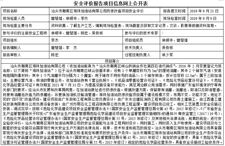 汕头市潮南区海珠加油站有限公司防渗改造项目安全评价
