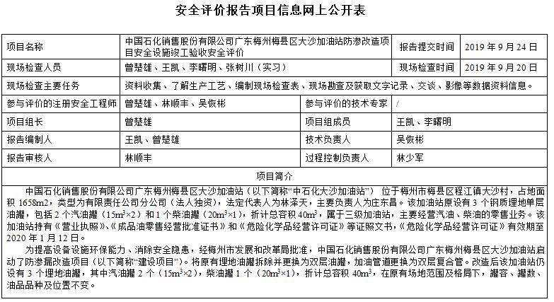 中国石化销售股份有限公司广东梅州梅县区大沙加油站防渗改造项目安全设施竣工验收安全评价