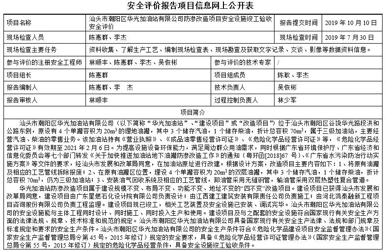 汕头市潮阳区华光加油站有限公司防渗改造项目安全设施竣工验收安全评价