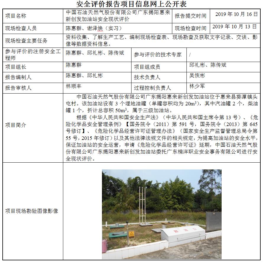 中国石油天然气股份有限公司广东揭阳惠来新创发加油站安全现状评价