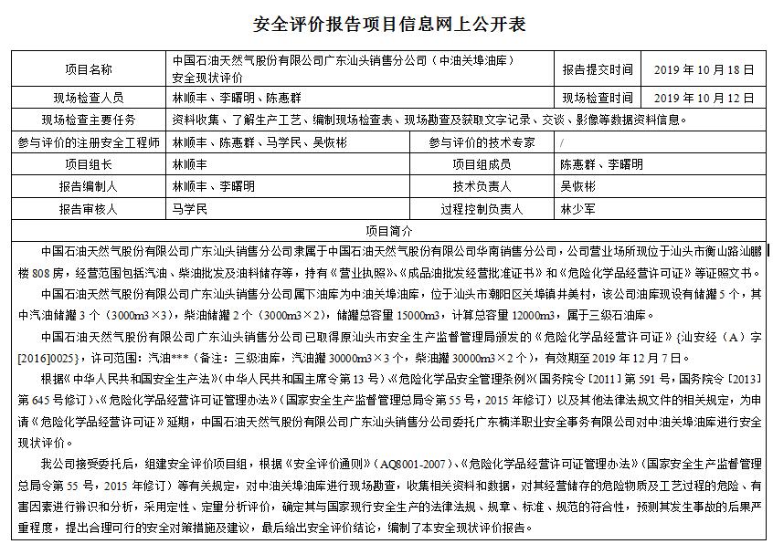 国石油天然气股份有限公司广东汕头销售分公司(中油关埠油库)安全现状评价