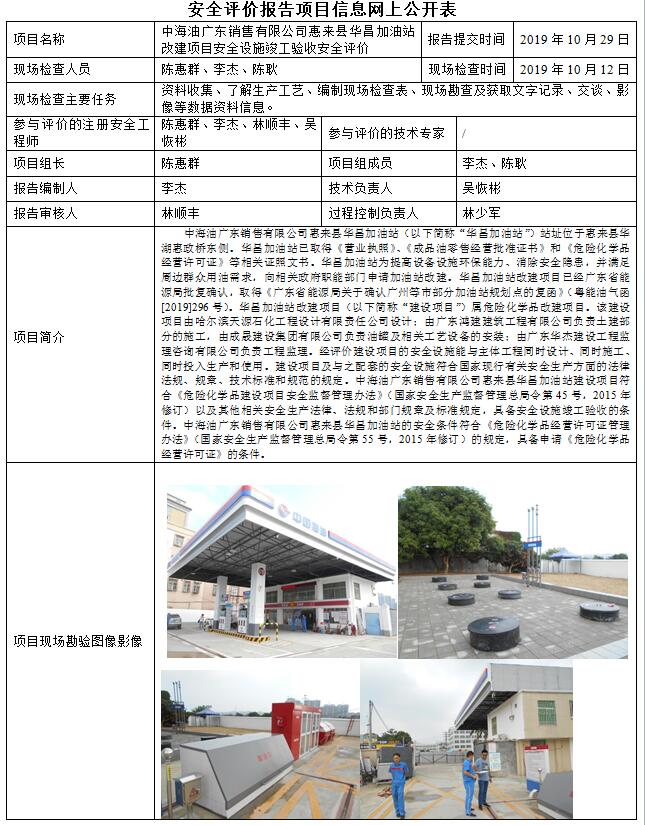 中海油广东销售有限公司惠来县华昌加油站加油站改建项目竣工验收安全评价