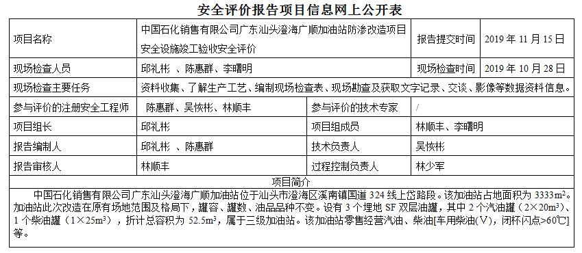 中国石化销售有限公司广东汕头澄海广顺加油站防渗改造项目安全设施竣工验收安全评价