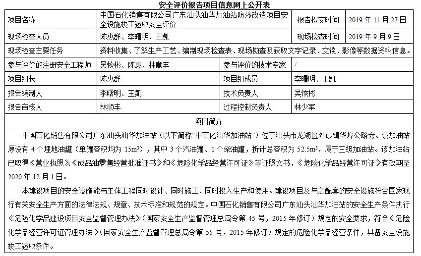 中国石化销售有限公司广东汕头汕华加油站防渗改造项目安全设施竣工验收安全评价