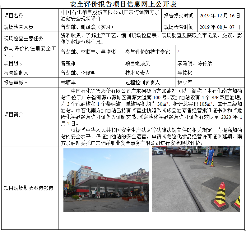中国石化销售股份有限公司广东河源南方加油站安全现状评价