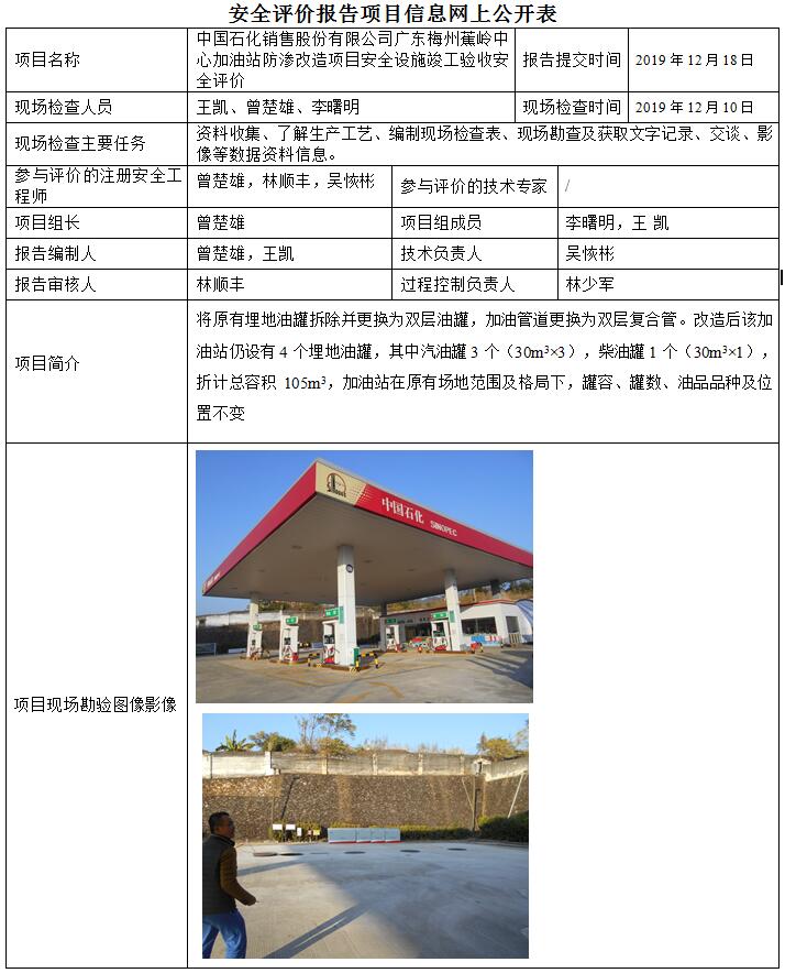 中国石化销售股份有限公司广东梅州蕉岭中心加油站防渗改造项目安全设施竣工验收安全评价