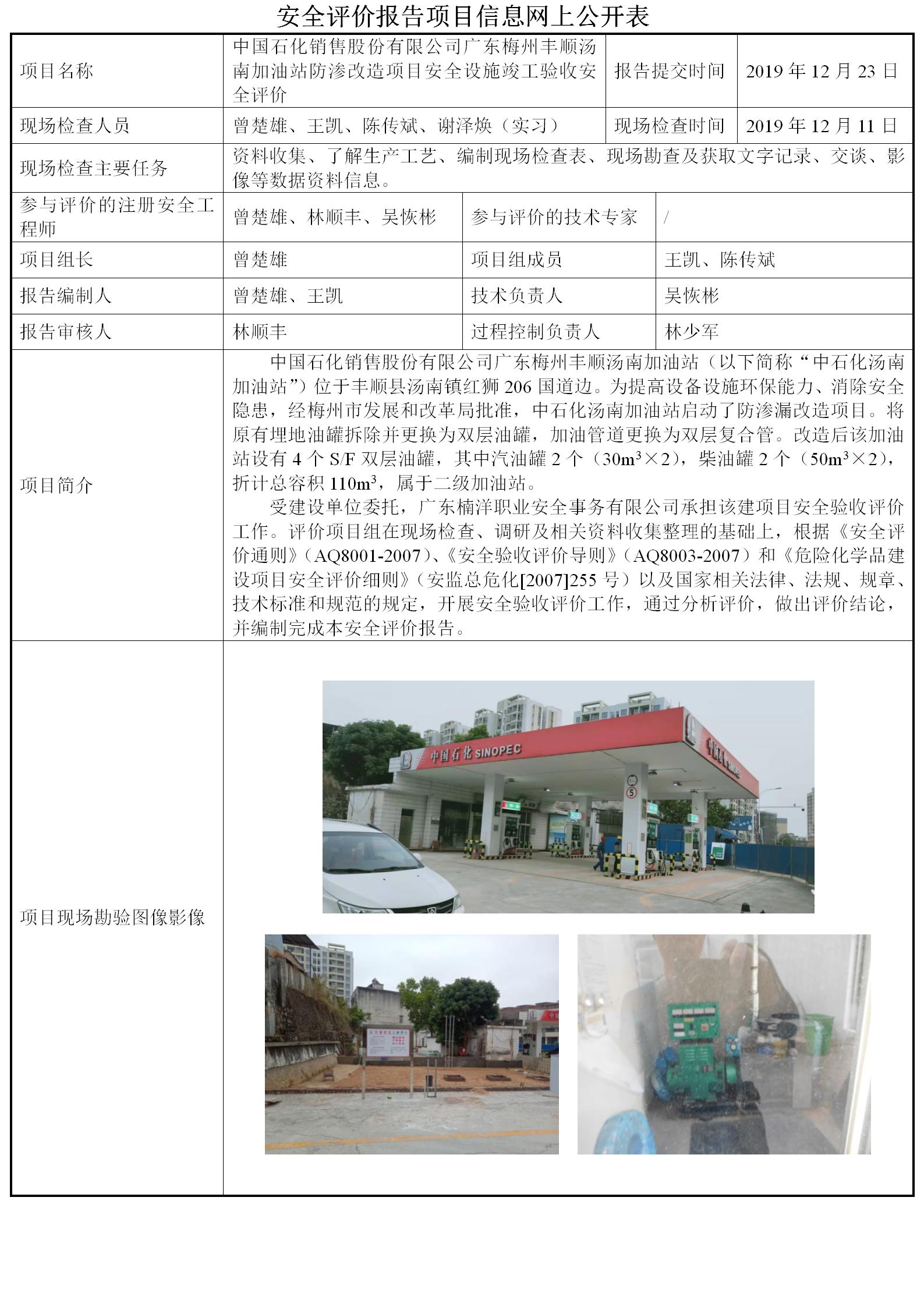 中国石化销售股份有限公司广东梅州丰顺汤南加油站防渗改造项目安全设施竣工验收安全评价