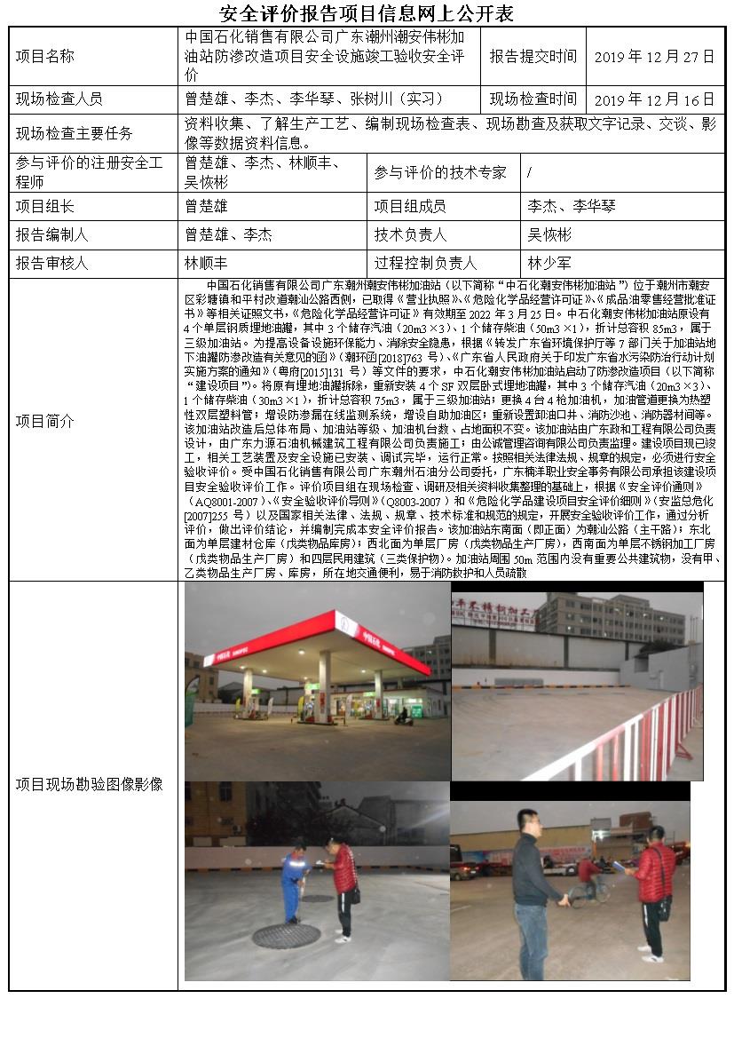 中国石化销售有限公司广东潮州潮安伟彬加油站防渗改造项目安全设施竣工验收安全评价