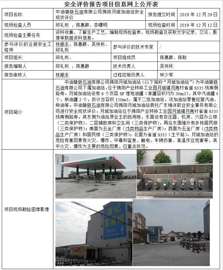 中油碧辟石油有限公司揭阳月城加油站安全现状评价